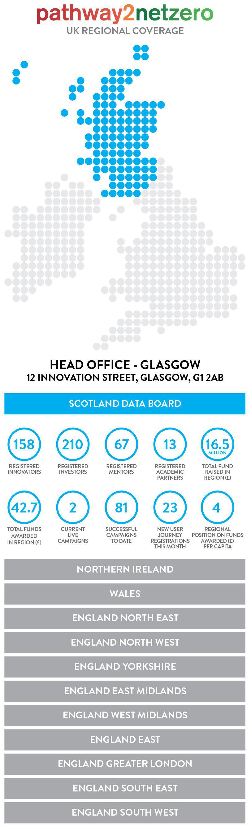 This information could potentially influence an Innovator's location decision, or encourage investment in a particular area of the UK, after noticing clusters of excellence in a certain NetZero Emissions Sector or Technology for example.