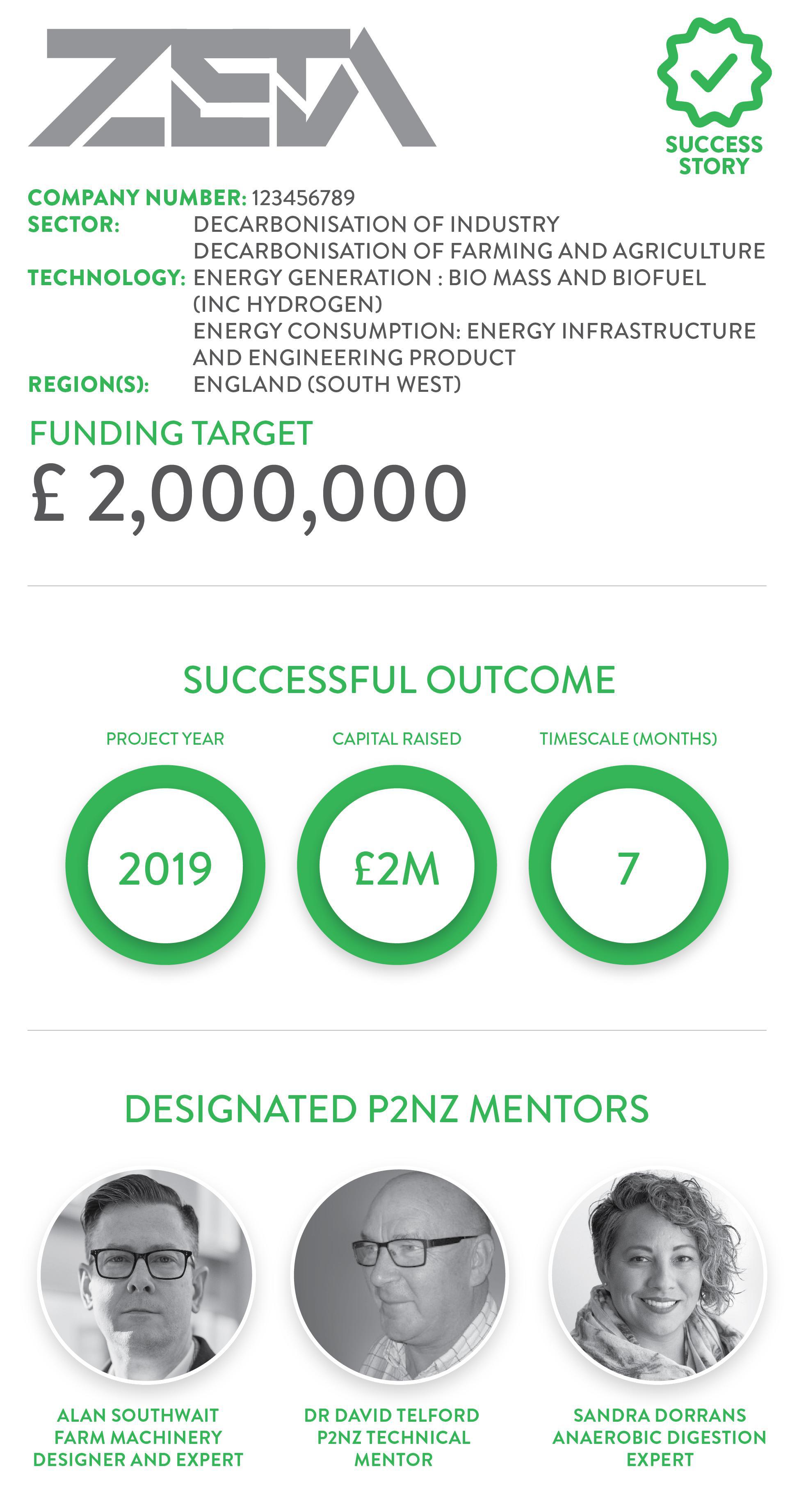Zeta have developed a prototype slurry dryer and compactor to allow local farmers in Cornwall to trial the farmyard machinery to thus prevent them using on the field which is limited by quantity and when it can be done by the environmental agency. They have also developed a prototype anaerobic digester that can generate power and heat for local industries from the dried slurry when mixed with other farm crops and grass silage.